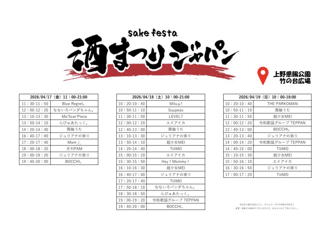 「酒祭りジャパン」@上野恩賜公園 噴水広場 2026.04.18 RAVE Tweet シェア 4月18日(土) 「酒祭りジャパン」@上野恩賜公園 噴水広場 ①13:10〜13:30 ②16:40〜17:00 ※各ライブ10分後から60分間グッズ販売! 入場無料! https://sakefesta.jp/2026/ 次の記事 一覧へ戻る 前の記事へ
